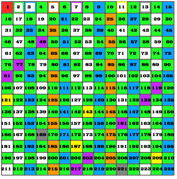 If you wanted to find all the primes up to 200, you need to make a square measuring 15 x 15. (This will actually give you all the primes up to 225.) You just work along the top row in the same way, and when you've finished all the primes will be revealed!