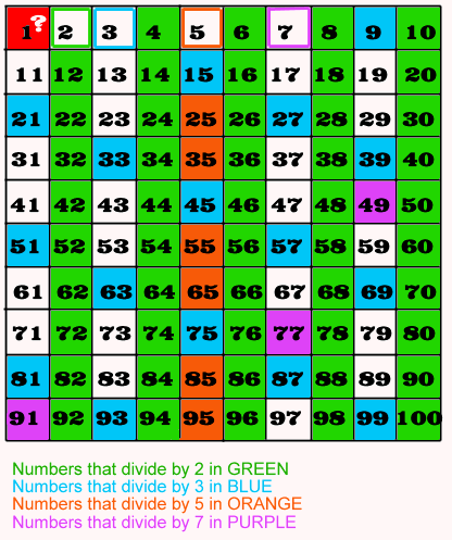 Why did we ignore the number 1? In the book you'll see how the EVIL NUMBER 1 causes all sorts of problems, especially with prime numbers. If we boxed the number 1 then coloured in every number that divides by 1, we'd end up colouring in ALL the numbers! That wouldn't get us very far so that's why we ignored it.