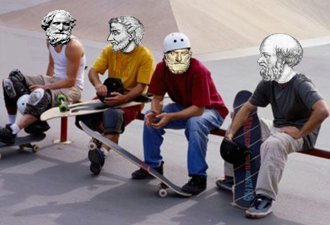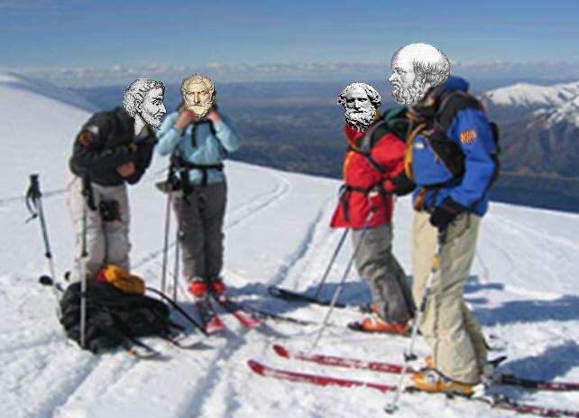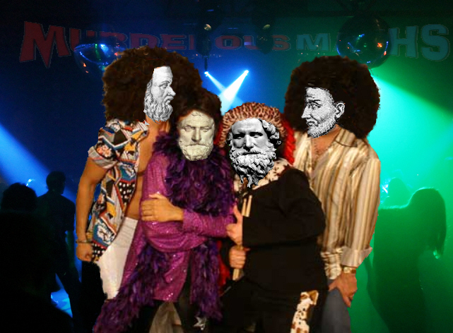 | | | Here's a nice one of the boys taken at Thales 300th birthday party in the Burning Bull Club, Miletos. (The club got its name after Thales proved that the angle inside a semicircle is always a right angle. He celebrated by having a bull dragged to an altar, then it was chopped open and a fire was lit inside it. You'll can find more jolly details like this in MM: Guaranteed to bend Your Brain. )