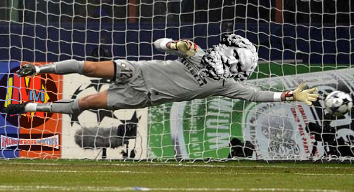 | Meanwhile over in Sicily, Syracuse Albion have met Samos Rovers in a pre-cup friendly. |  |   |  | It looked like Samos were about to go 1-0 up if it hadn't been for this cracking save by Archimedes. It was probably while lining the ball up for a goal kick that he realised its volume would be exactly 2/3 rds of the smallest cylinder that would contain it. There's a lot more about Archimedes in The Perfect Sausage   MM Guaranteed to Bend your Brain and Desperate Measures. |  |