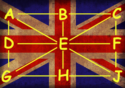 Call the horses A,B,C etc, and see how we've marked them on the Union Jack. Using the crosses and diagonals on the flag, the horses are linked in sets of three with eight straight lines.