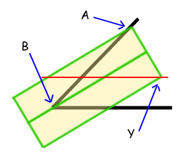 You now put two rulers together and lie them on your diagram as shown here. The middle of the two rulers lies on point B, The top corner lies on point A and the lower corner lies on the line you just drew at point Y. To get this right takes a bit of fiddling about ... and that DOES break the rules! |
