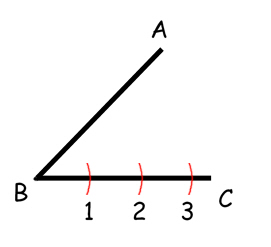 We can start with any angle in between about 30º and 90º. Here we've labelled the angle ABC. Using compasses measure off three equal sections along BC labelled 1,2,3. |
