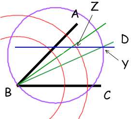 Now you bisect angle ABD. You can use cross lines again, and you end up drawing line BE. After that, you draw a circle. The centre point is X which is where BE crosses the "2" arc, and the circle goes through point B. (So the circle will have the same radius as the 2 arc.) The circle cuts BD at point Y. |