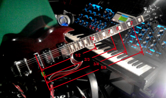 Modern guitars work in exactly the same way. If you have a guitar and count up from the end of the neck to the 12th fret, you should find that’s exactly halfway along the string. The 7th fret should be 2/3, the 5th fret should be 3/4 and the second fret should be 8/9.